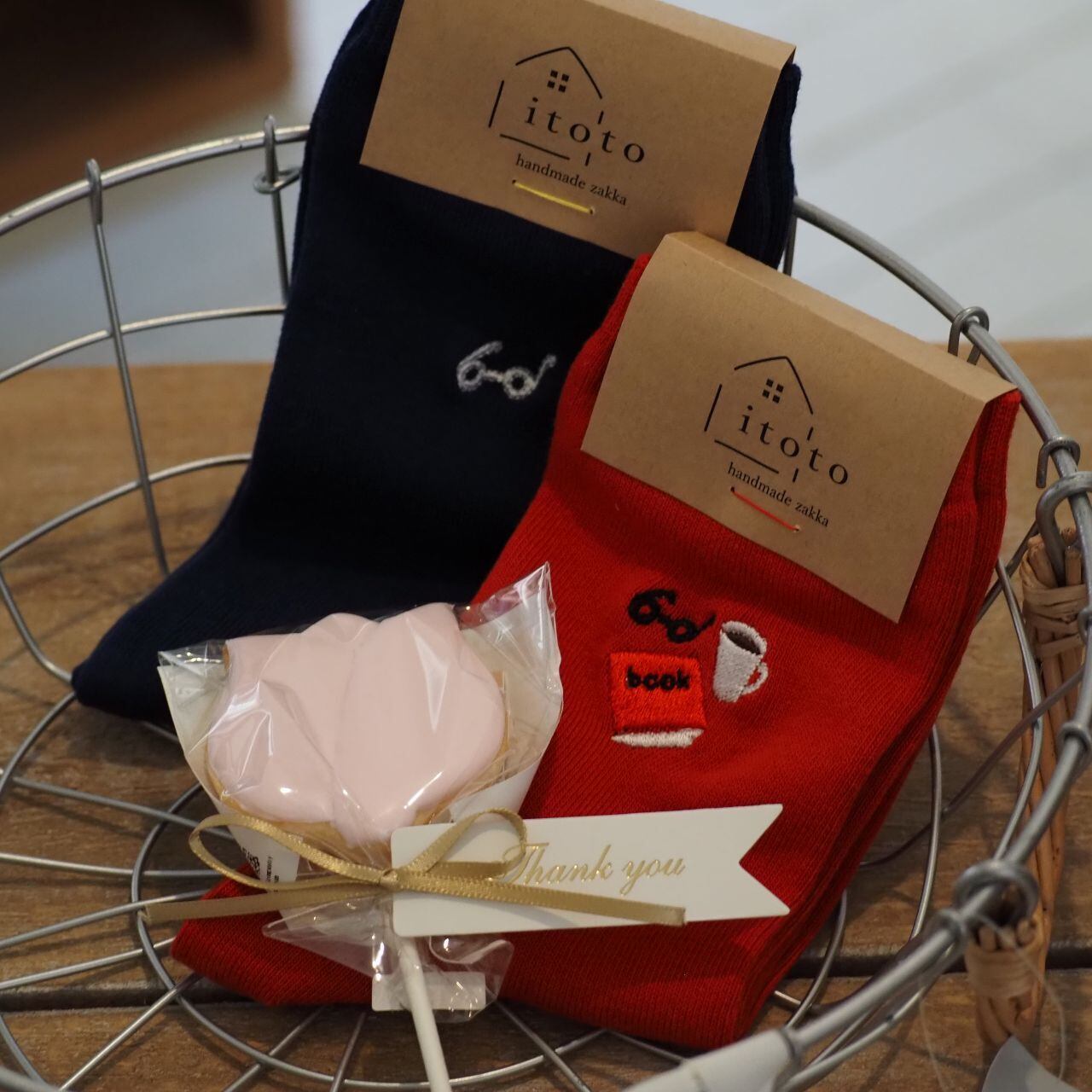 お揃いの柄のタオルハンカチや色違いの靴下もご用意しております。