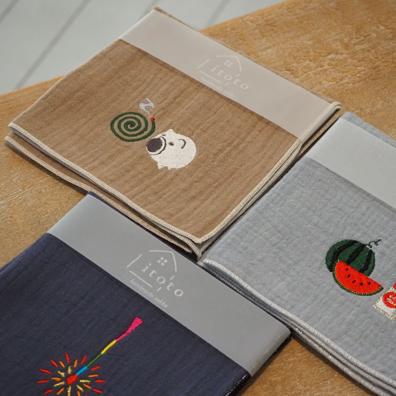 ふわふわとした優しい手触りの小ぶりなサイズ感にitotoのオリジナルのワンポイント刺繍が入ったガーゼハンカチ。