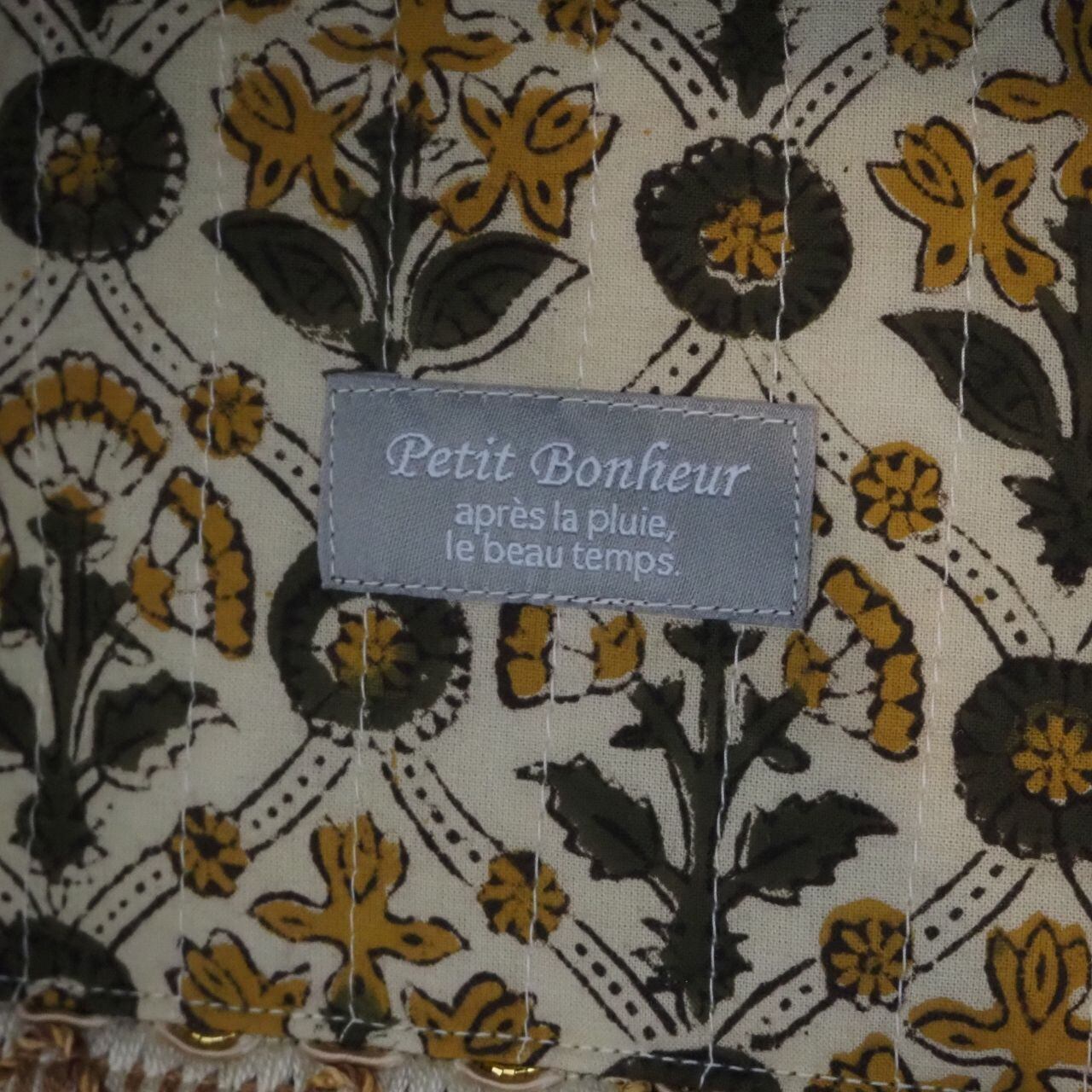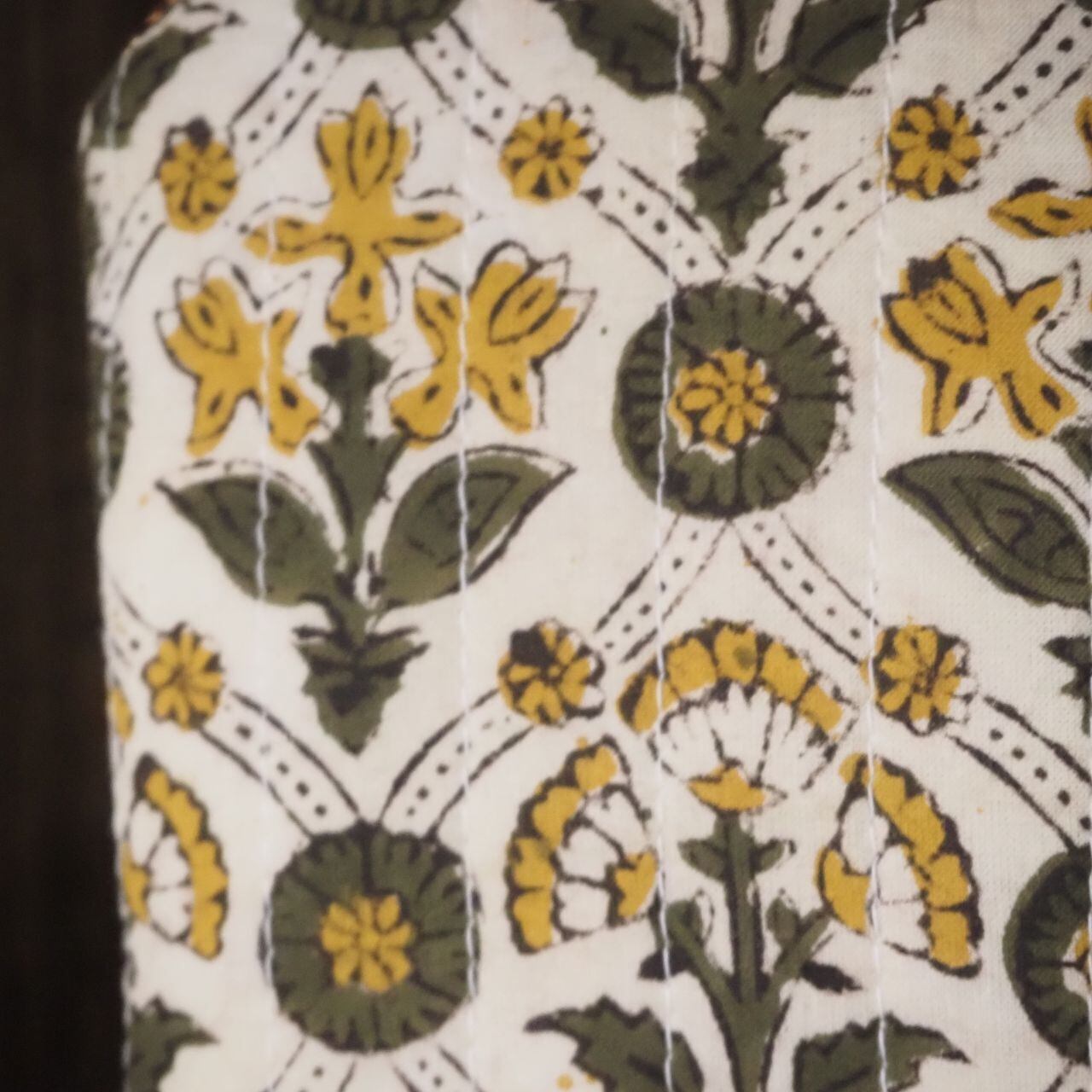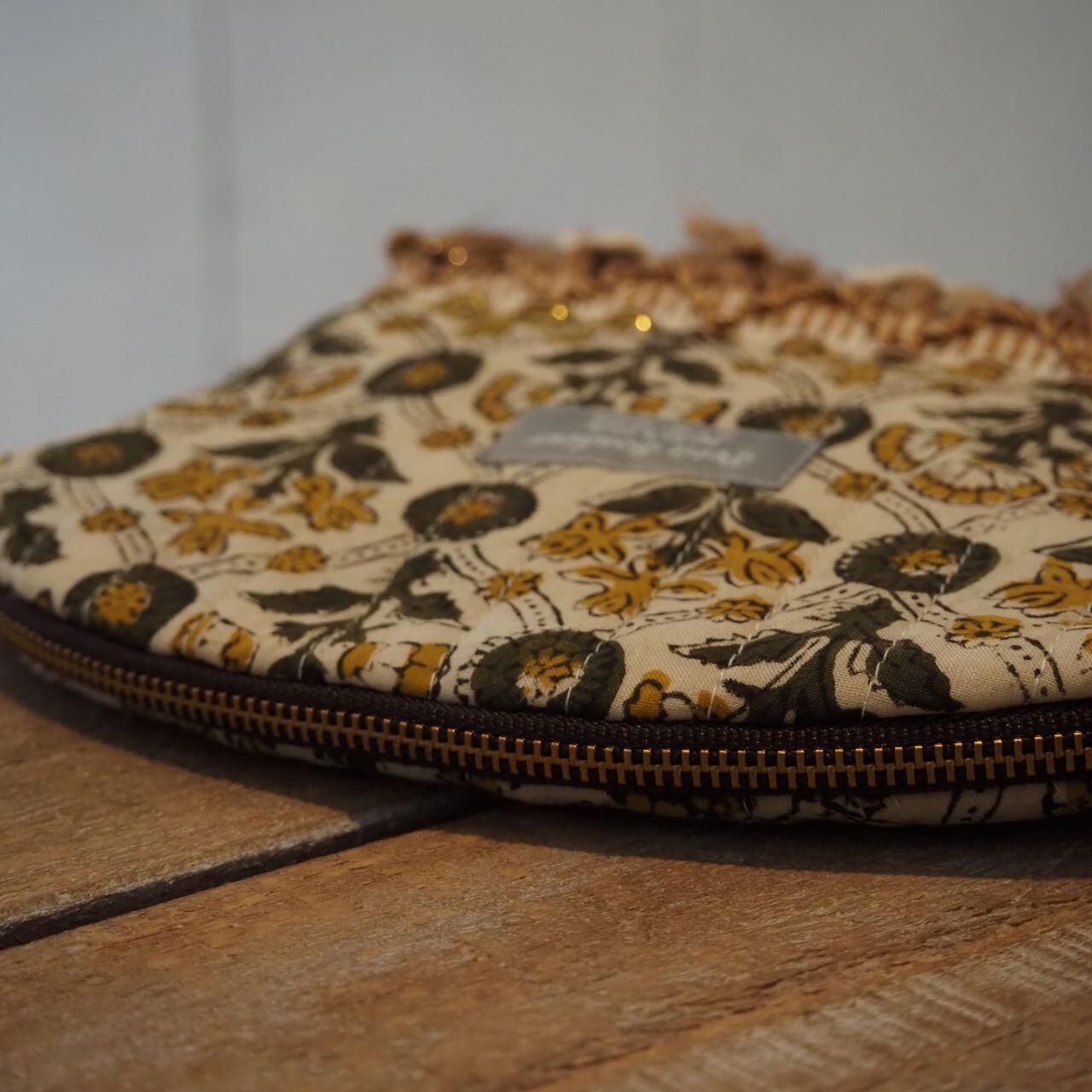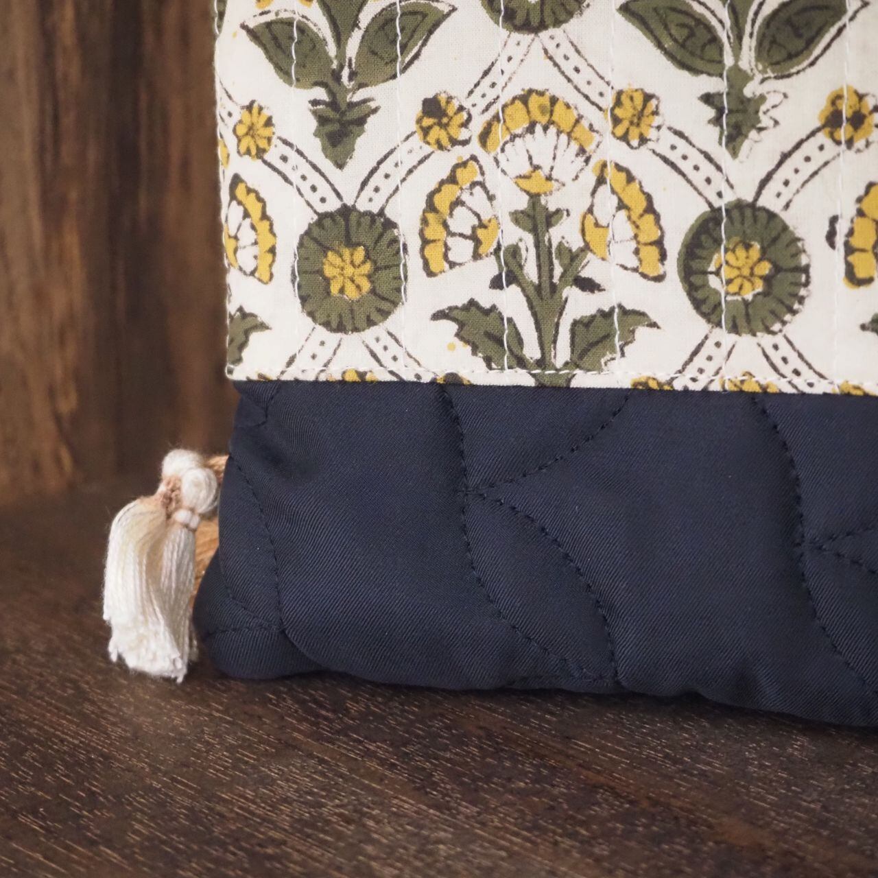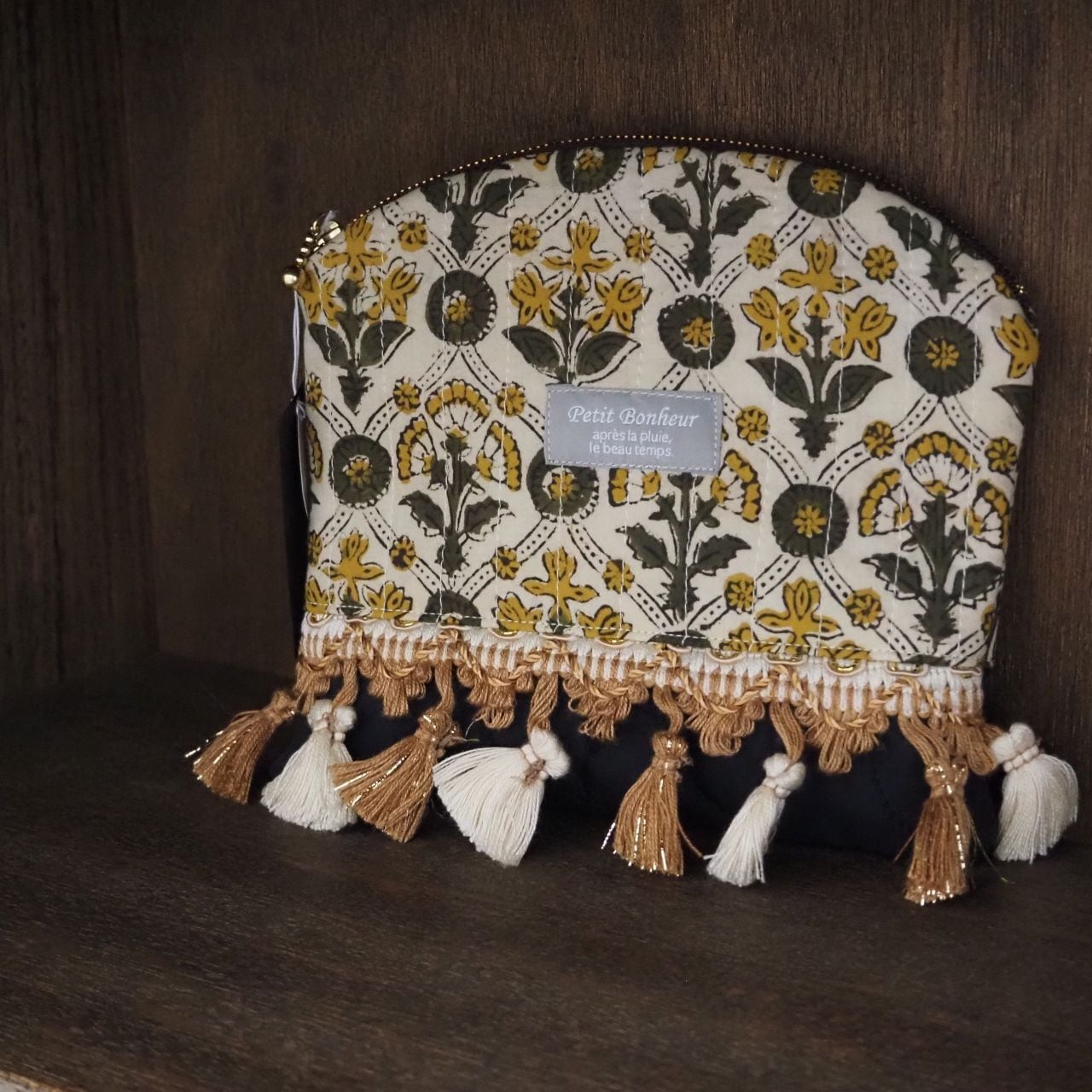 落ち着いたイエローカラーの花柄のキルト生地を使ったポーチ。