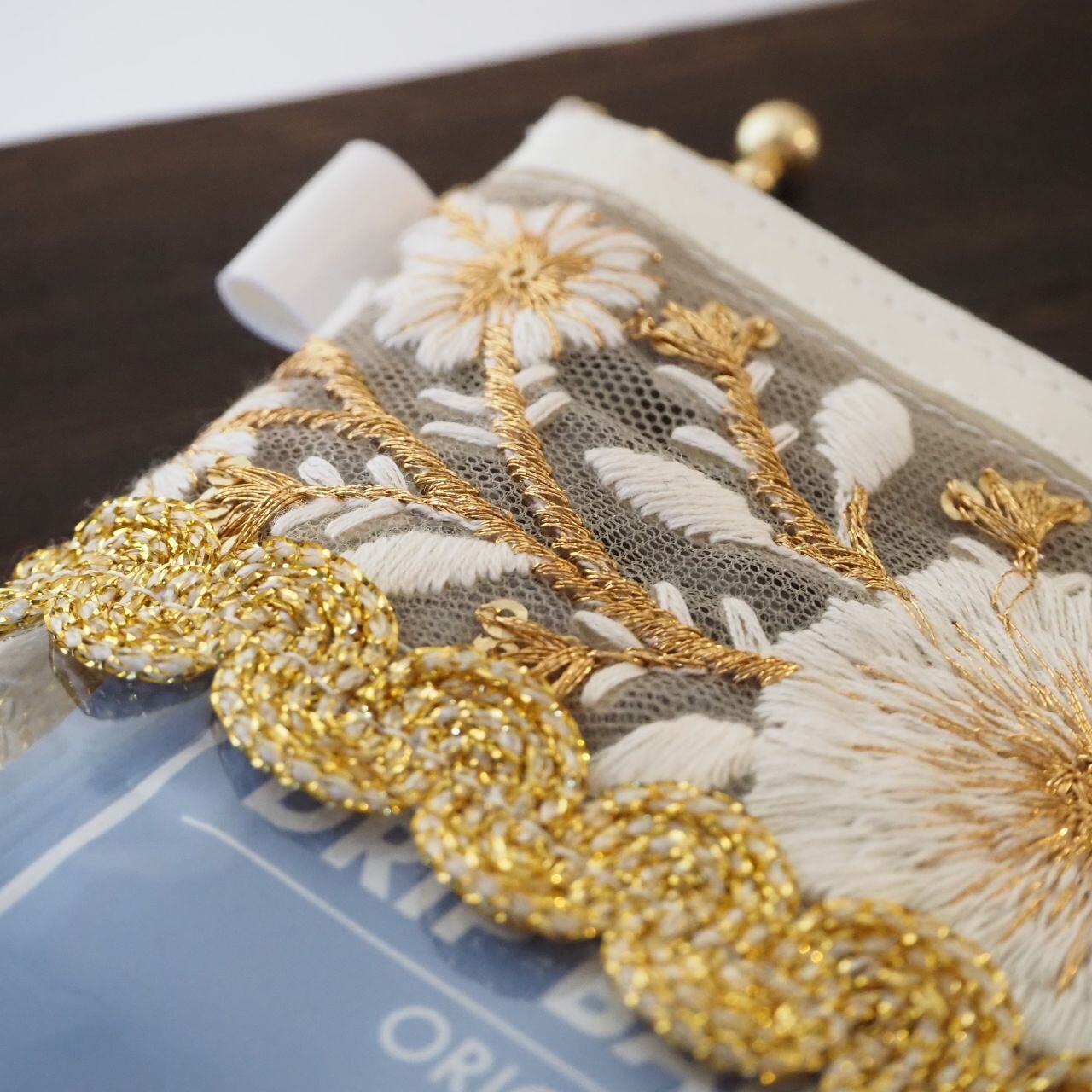 ビニール素材のポーチに繊細な刺繍のテープを合わせたポーチ。