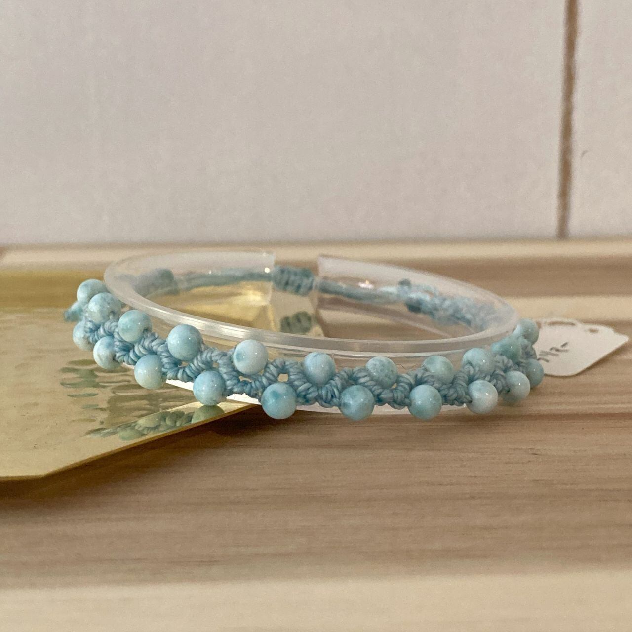 愛と平和の象徴とされ、やすらぎと慈悲を心の中にはぐくむとされる「ラリマー」の小さめサイズのストーンをたくさん編み込んでボリューム感あるデザインに仕上げたブレスレット。