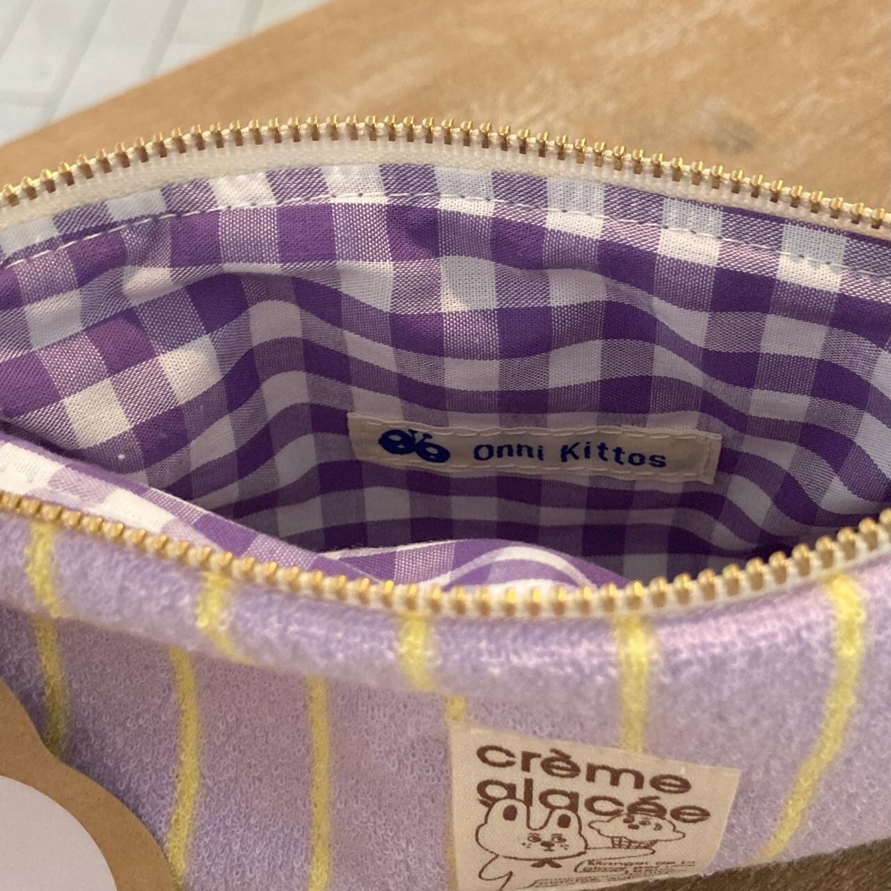 ラベンダー×イエローのストライプが目を引く、ポップでカラフルなファスナーポーチ。