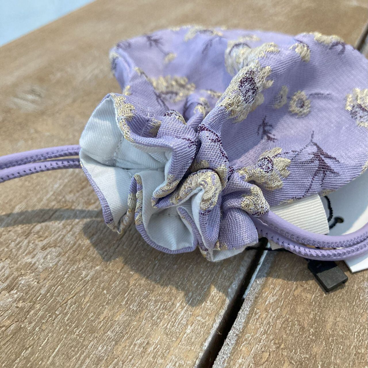 ラベンダーカラーの美しい花柄のジャガード織生地でしつらえたポーチ。