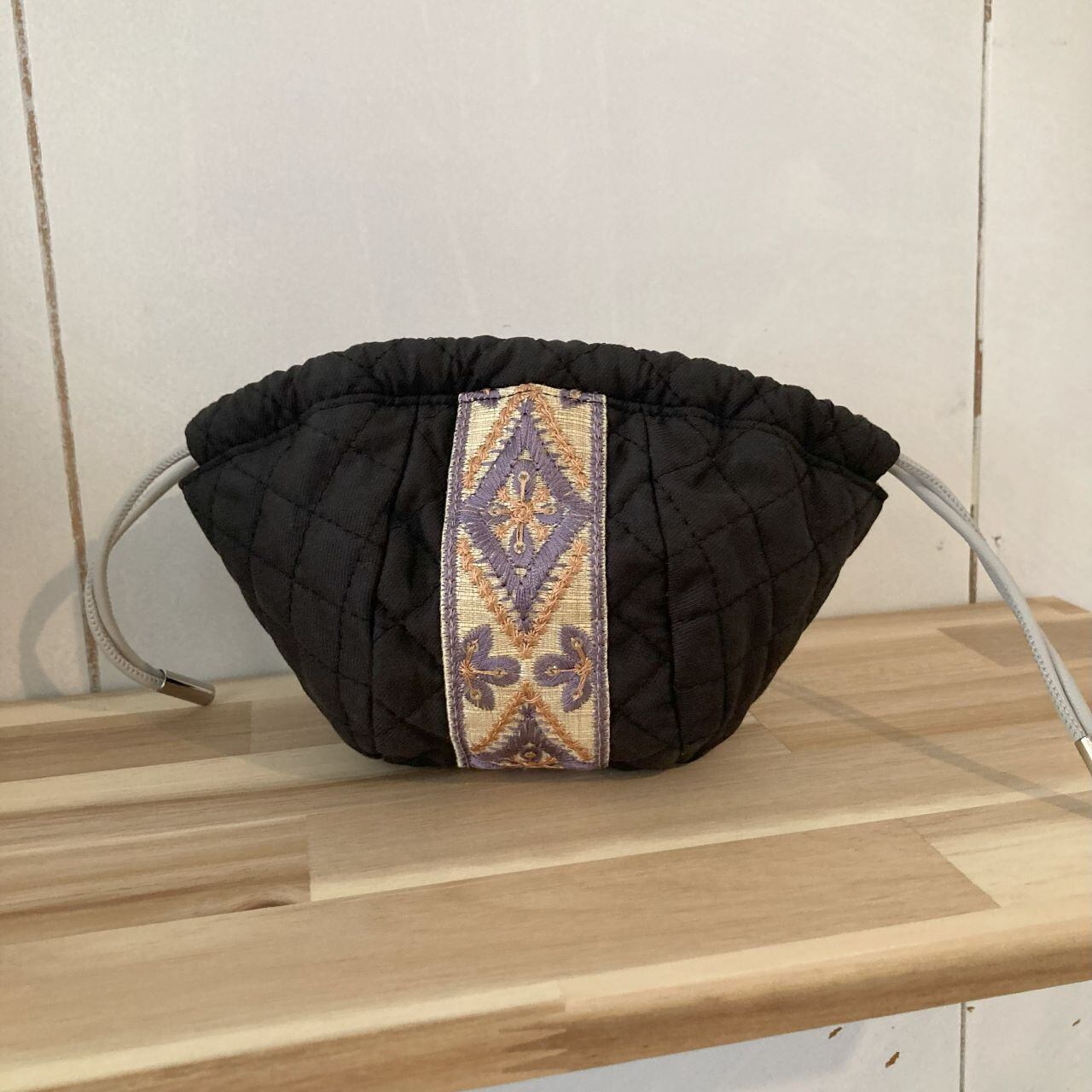 ポコポコとしたキルト生地に、美しいインド刺繍リボンを彩った手のひらサイズの巾着ポーチ。
