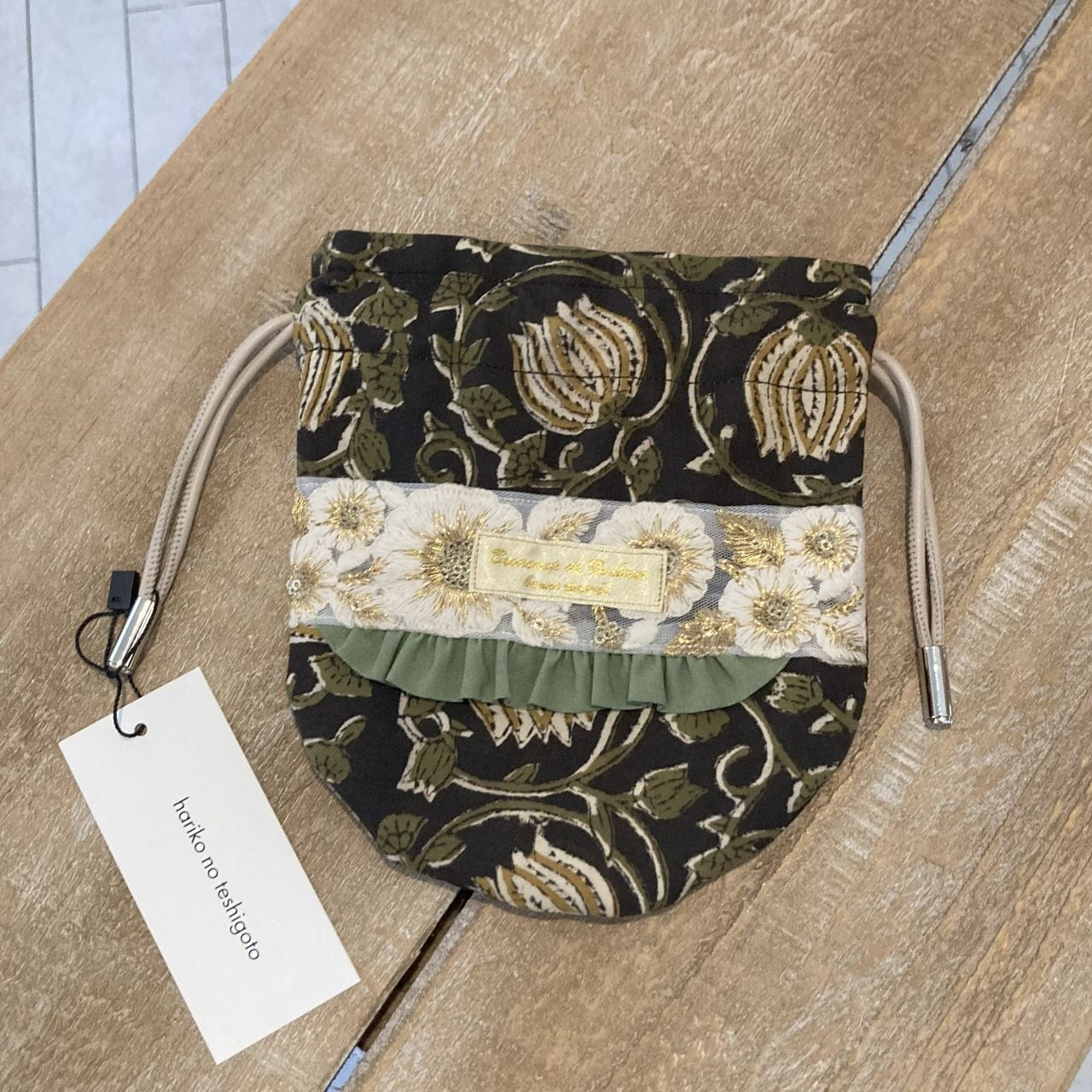 ブロックプリント生地に、美しいインド刺繍リボンを彩った使いやすいサイズの巾着ポーチ。