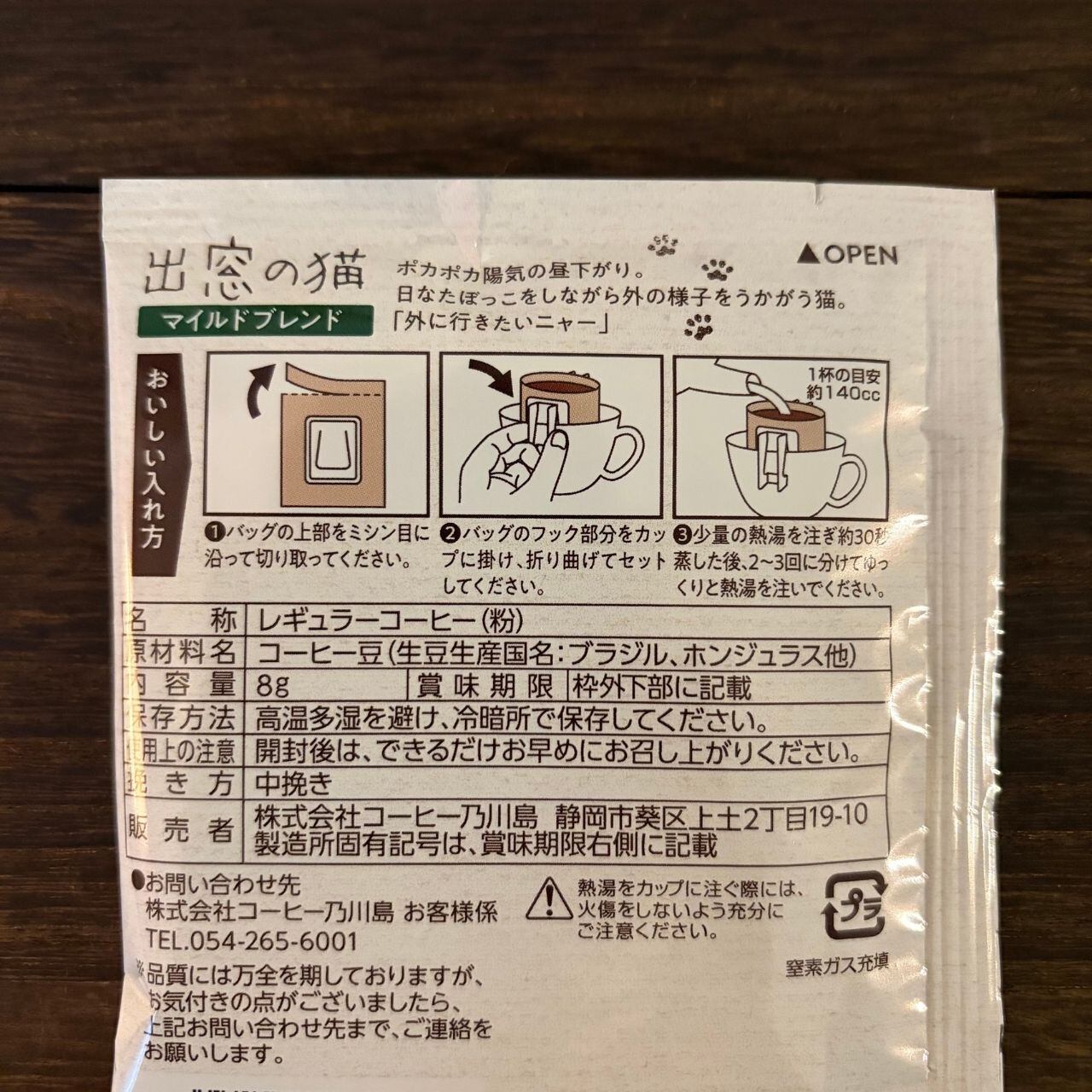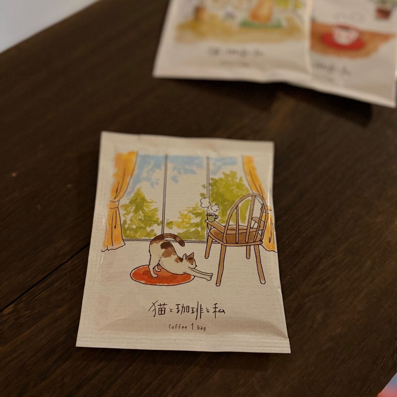 手描きで描かれたかわいい色合いの猫と珈琲のイラストが入ったコーヒーのドリップバッグ。