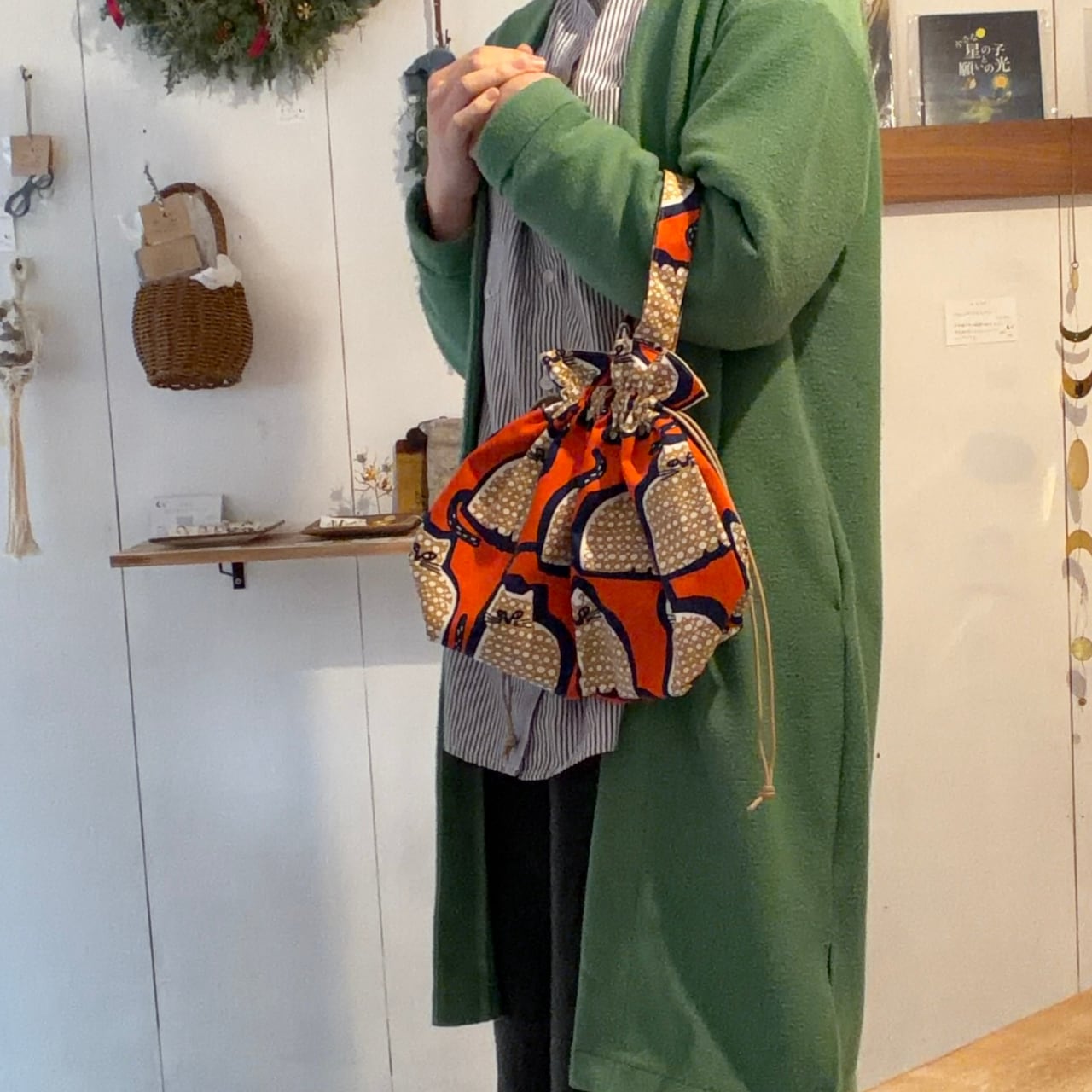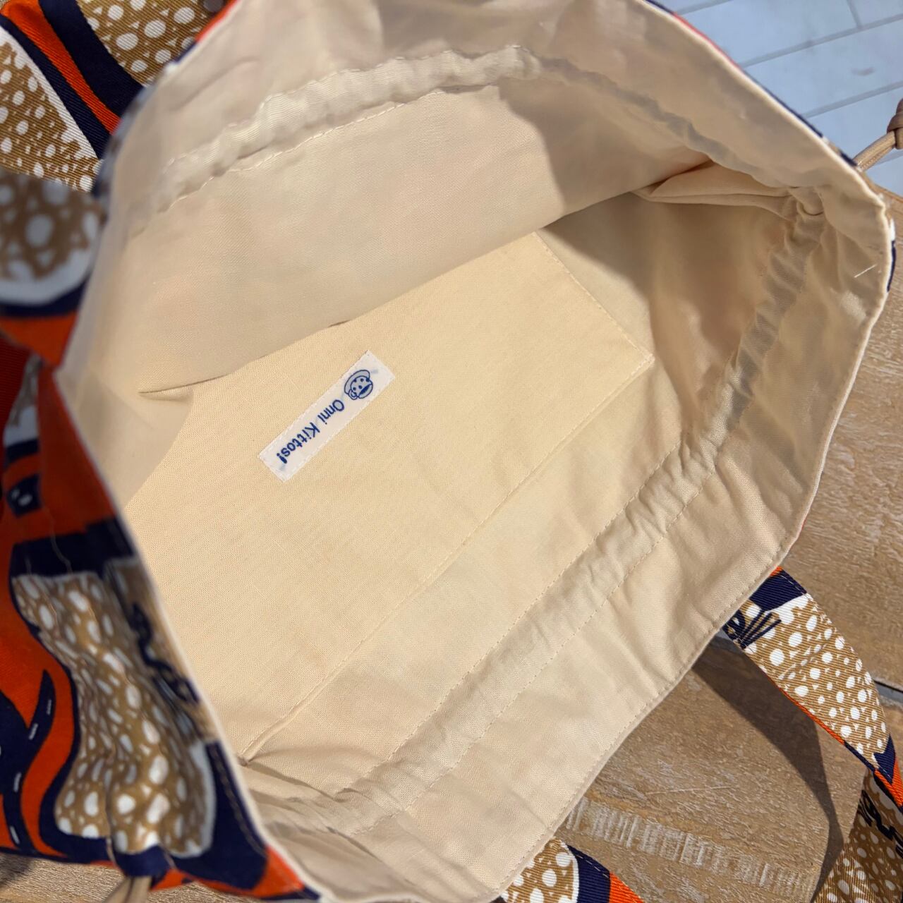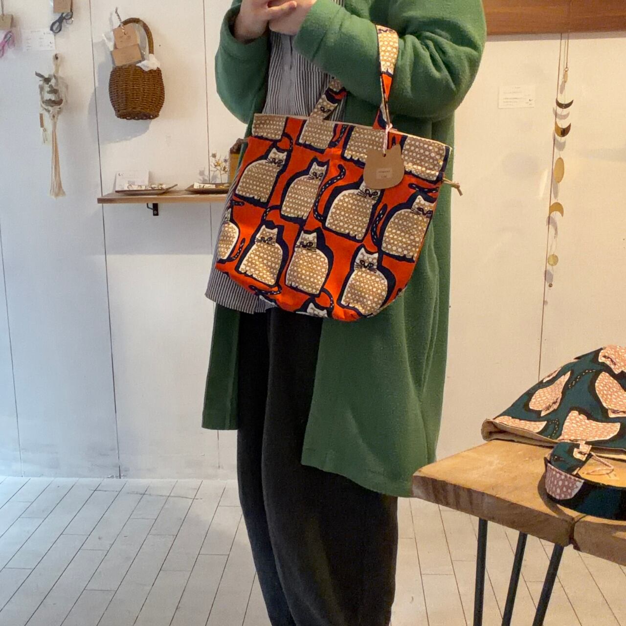 ビビッドなオレンジ色に描かれた猫がかわいらしい巾着型のトートバッグ。