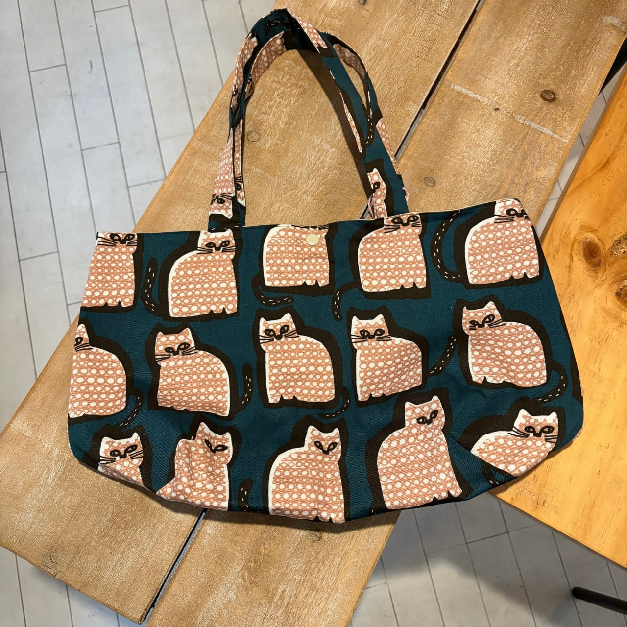 ちょっとクラシカルな深いグリーン地に描かれた猫がかわいらしいトートバッグ。