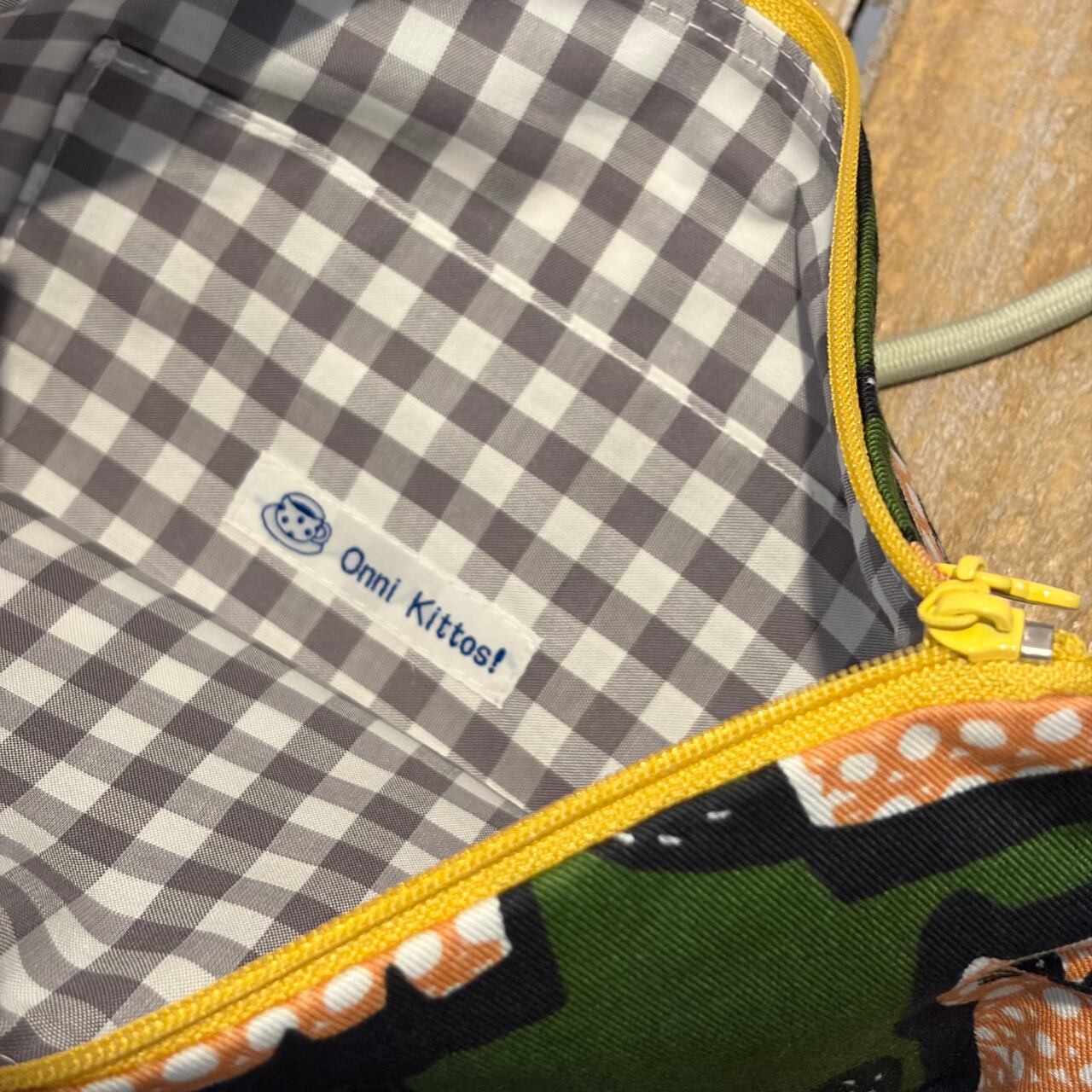 ちょっとクラシカルなグリーン地に描かれた猫がかわいらしいサコッシュ。