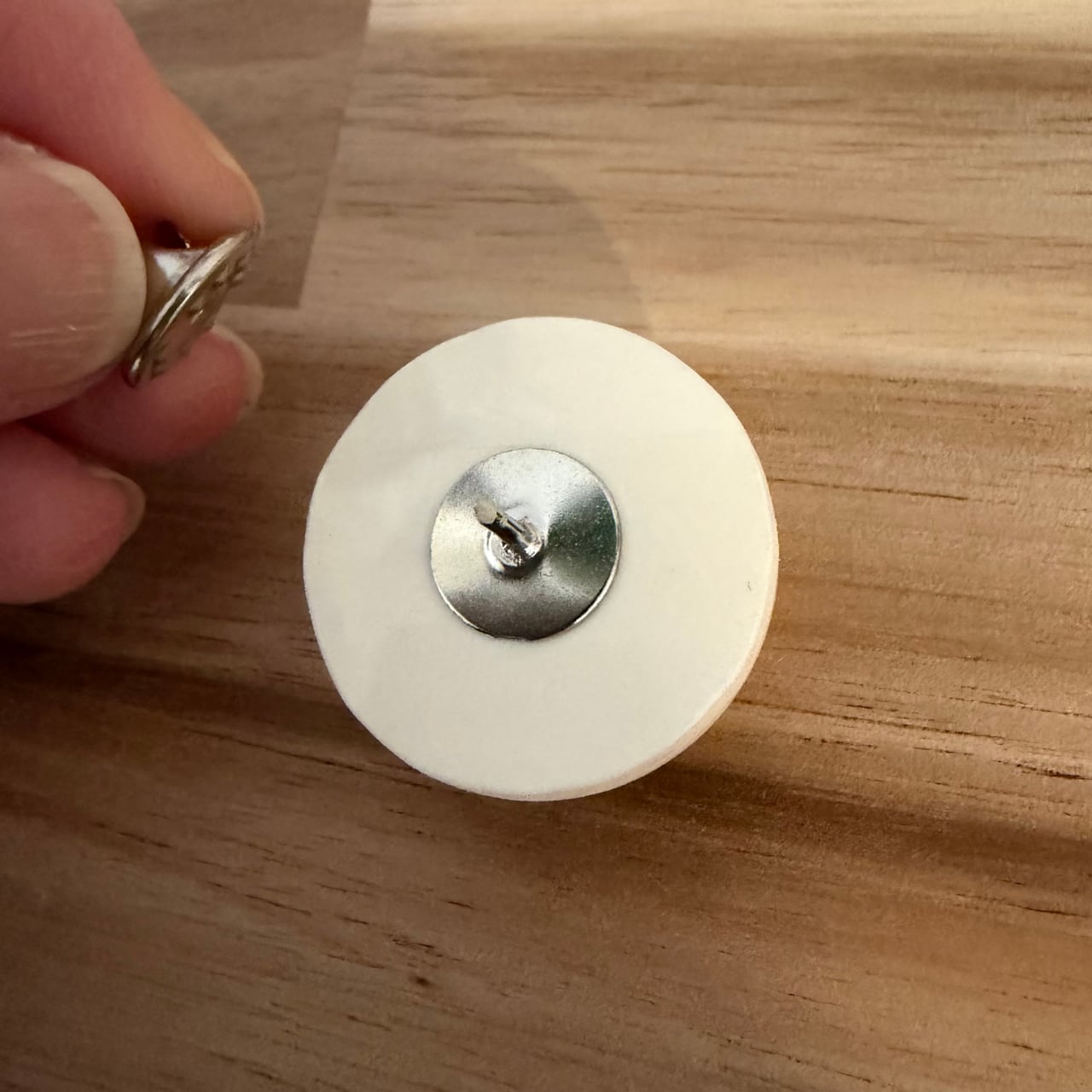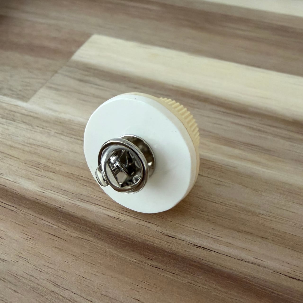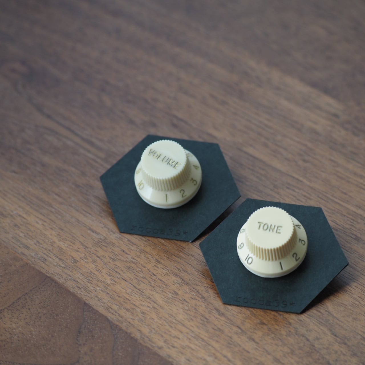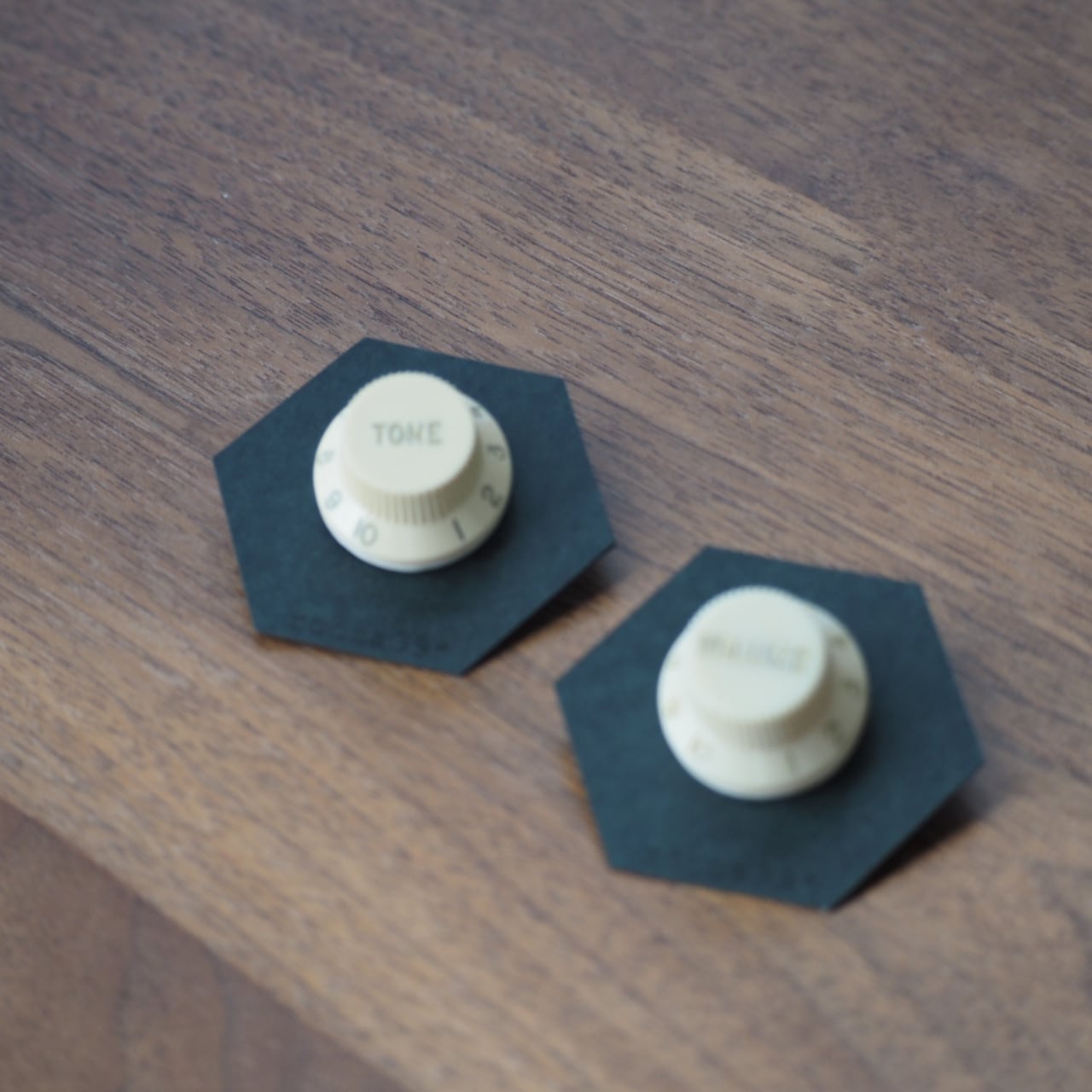 「TONE」「VOLUME」と書かれているギターのノブをピンバッチに仕立てた作品。